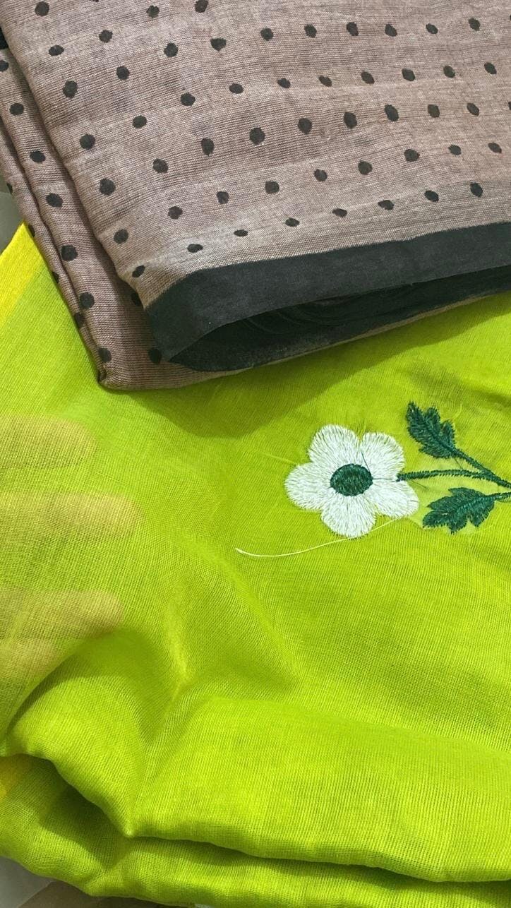 Lime green floral embroidery mulmul cotton saree all over embroidery