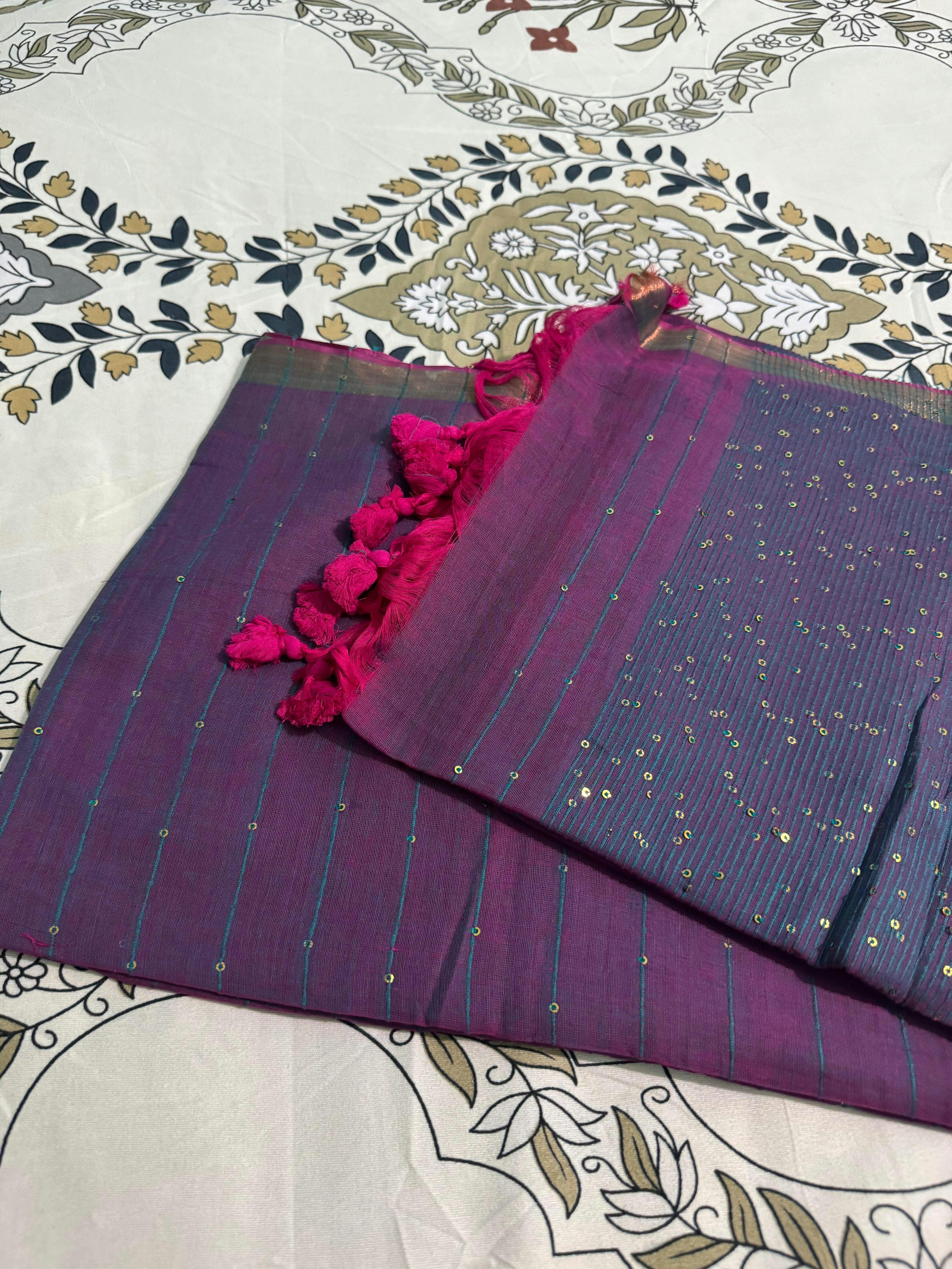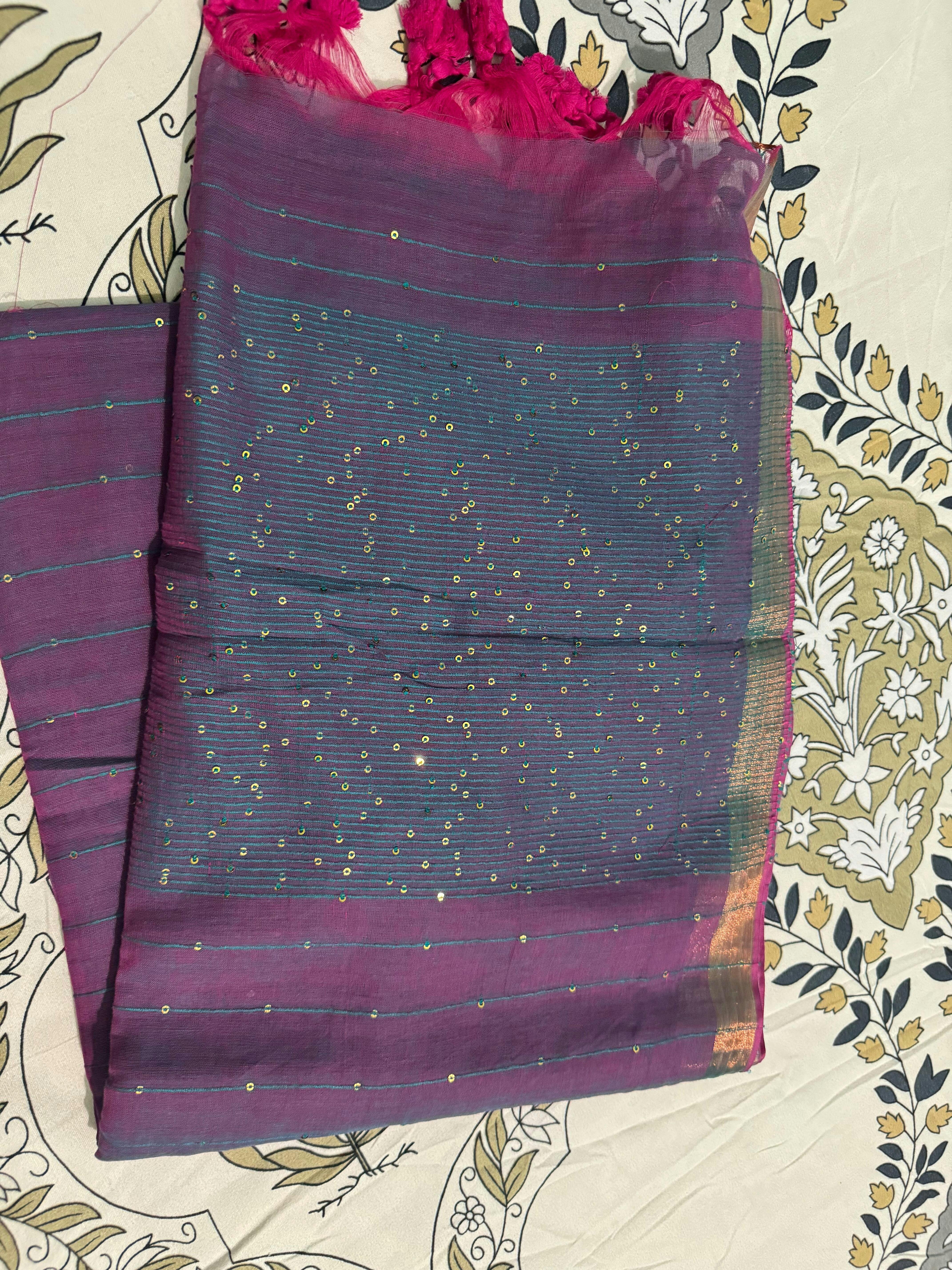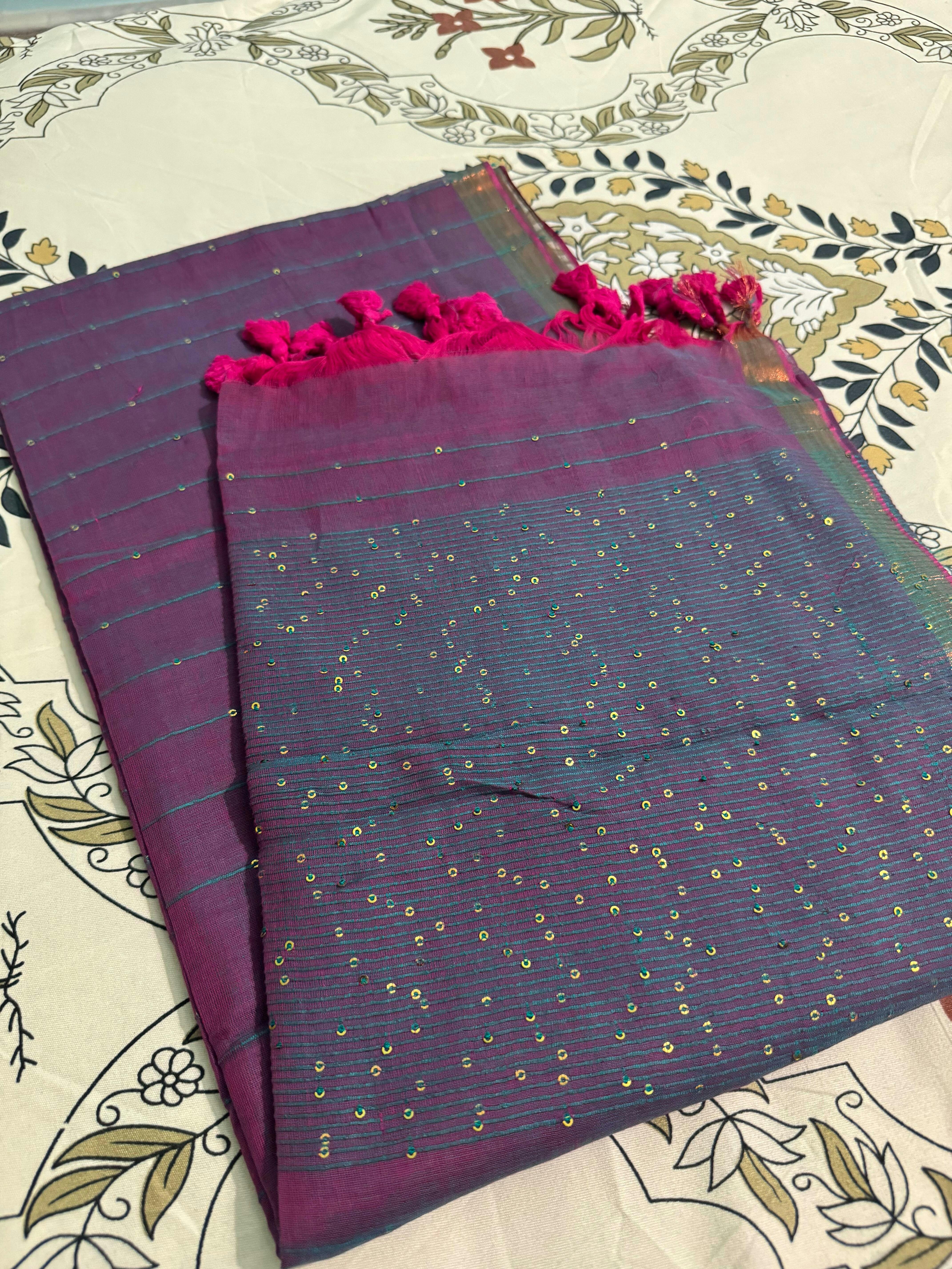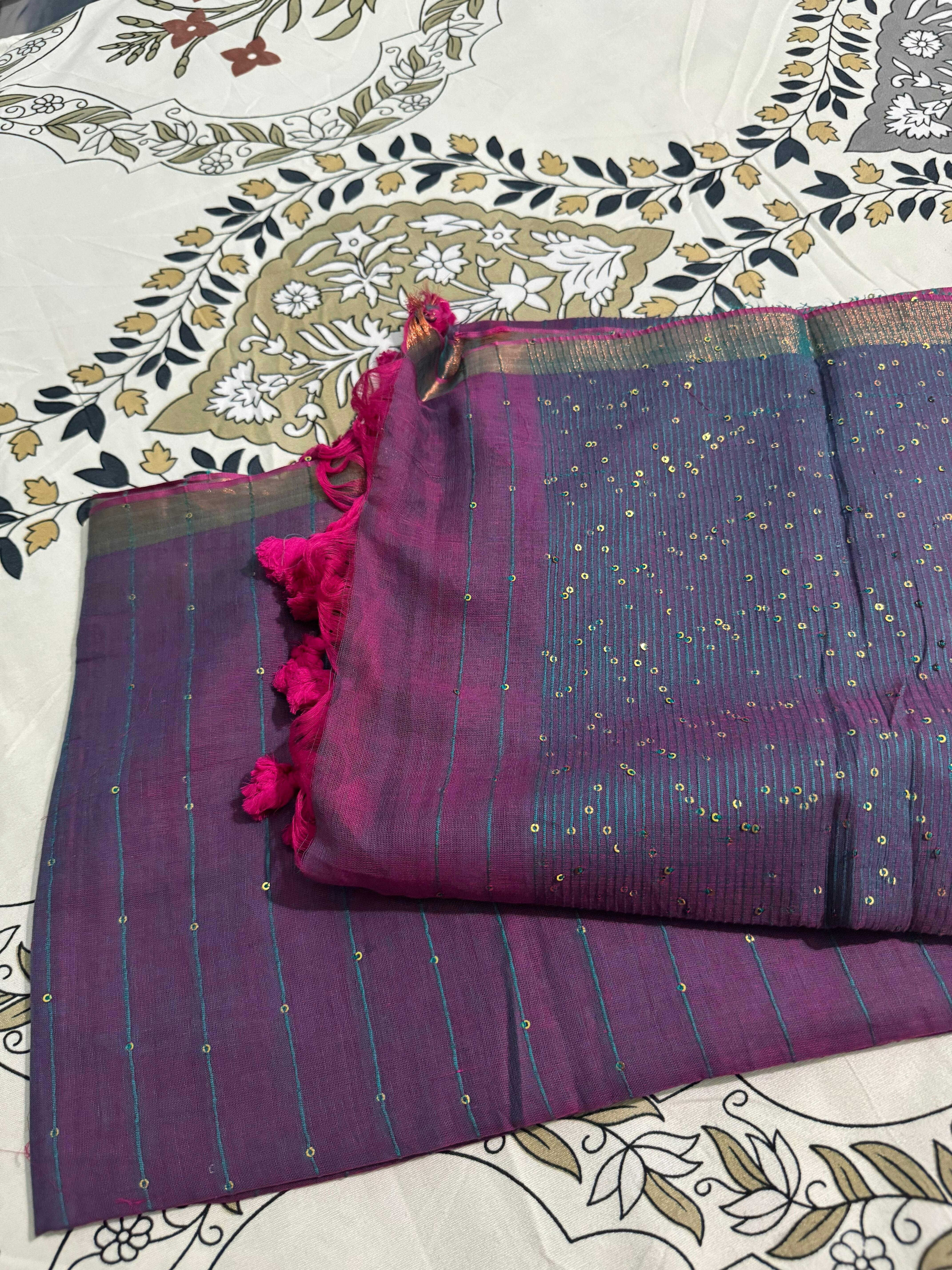 Blue Rani Mohini sequence work Dual Tone Mulmul Saree