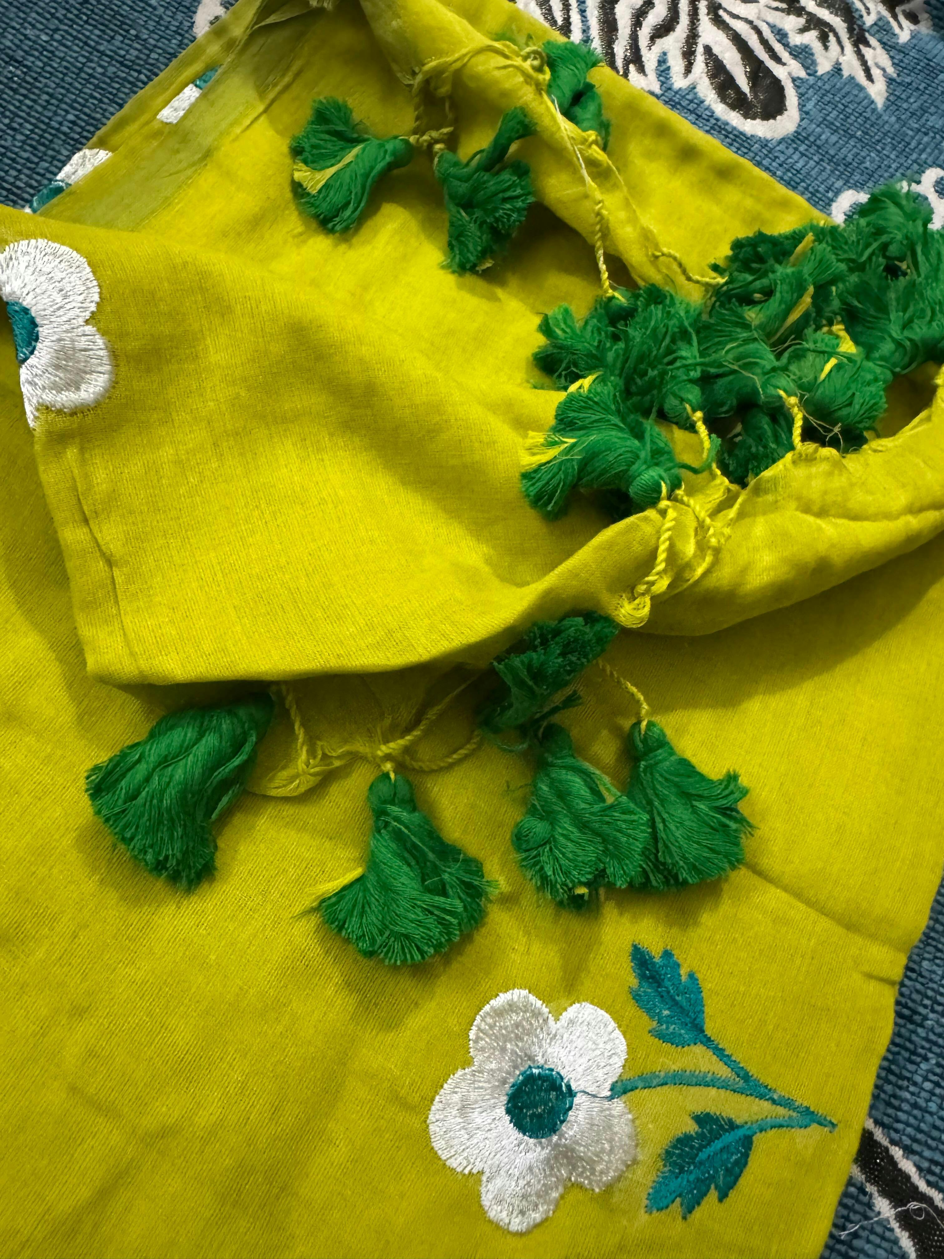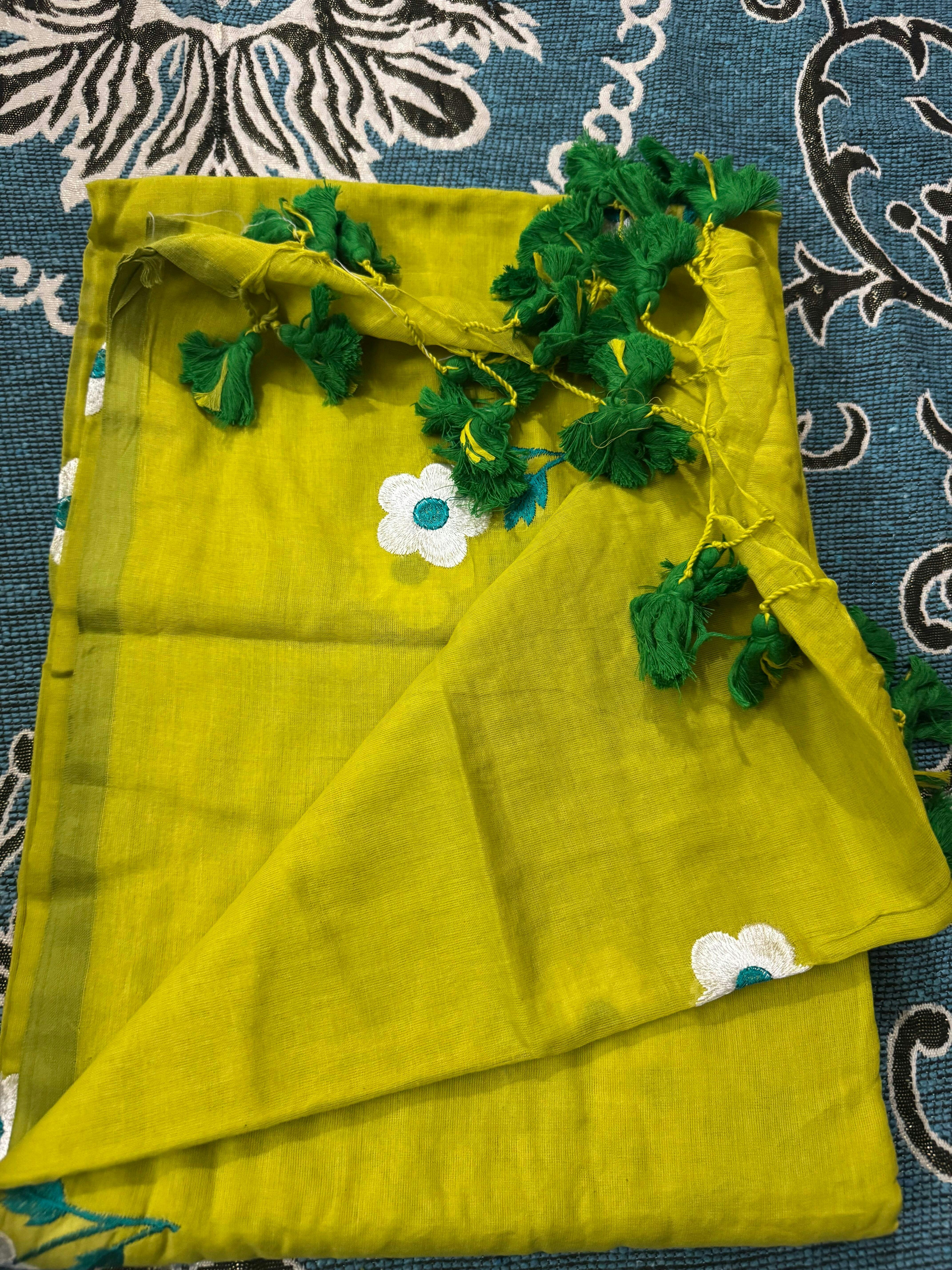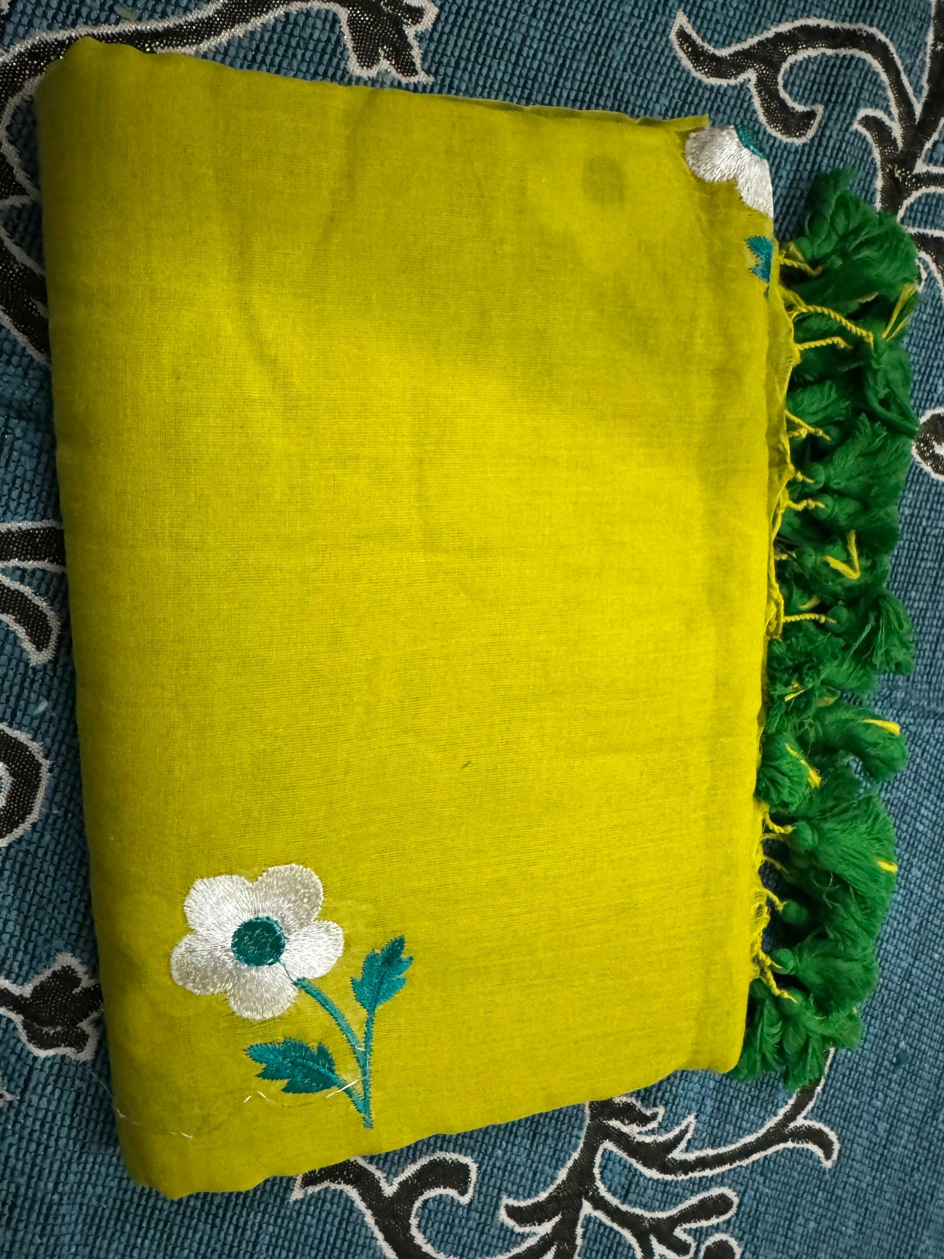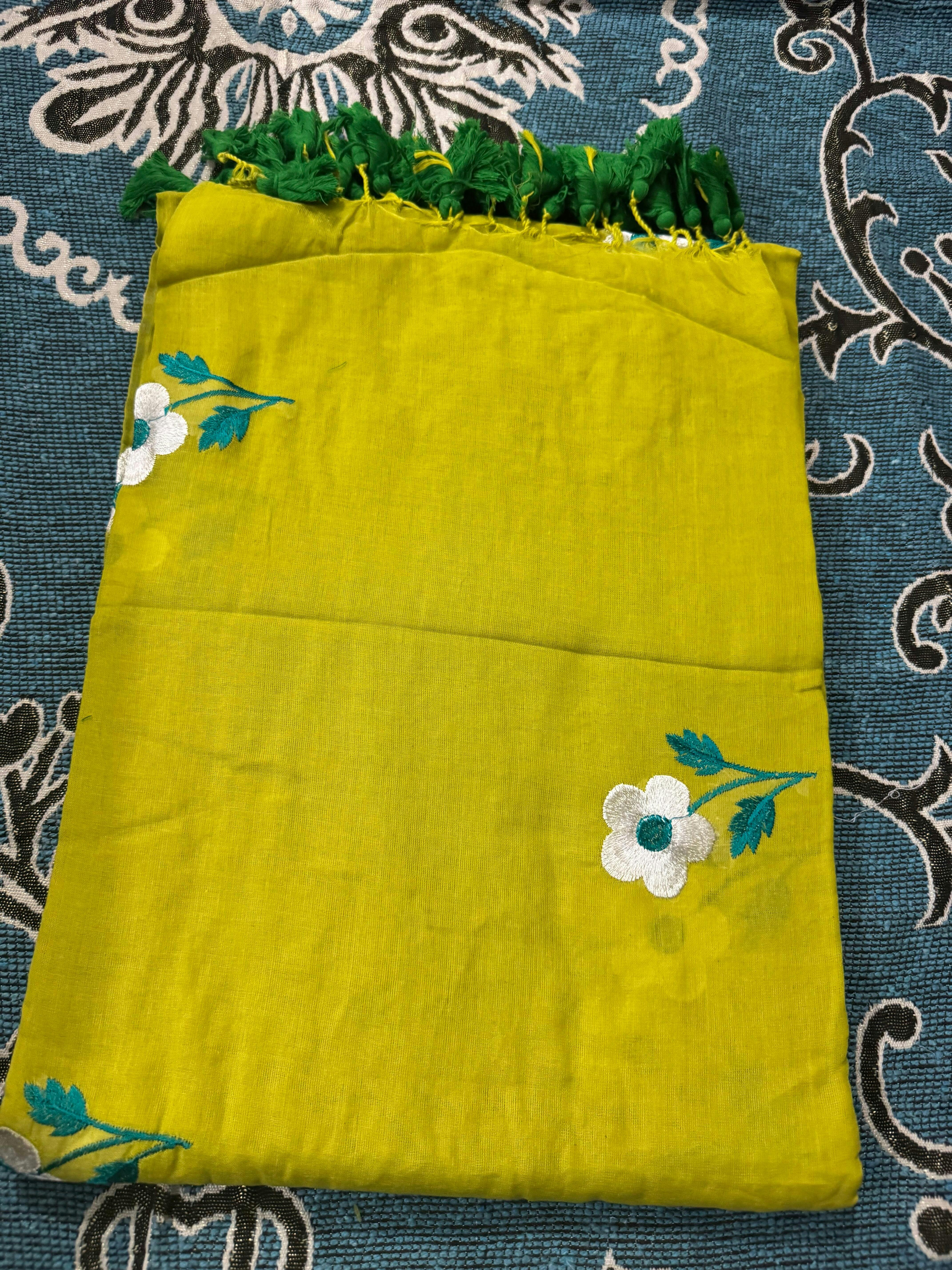 Lime green flowers all over embroidery mul cotton saree